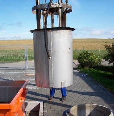 為了清空收集籃,要解開(kāi)壓力軟管,用提升裝置將籃子完全從池子里拉出來(lái),砂礫和碎片保留在籃子里,殘留水通過(guò)收集籃的底部排出。將籃子清空倒入垃圾箱或直接倒入垃圾車(chē)。拉動(dòng)中間的解鎖桿就可以將柵格折疊而打開(kāi),砂礫會(huì)從底部落下。籃子清空以后,旋轉(zhuǎn)柵格,將籃子放回池子里。等重新接上對(duì)壓力耦合,砂礫收集器可以準(zhǔn)備工作了。